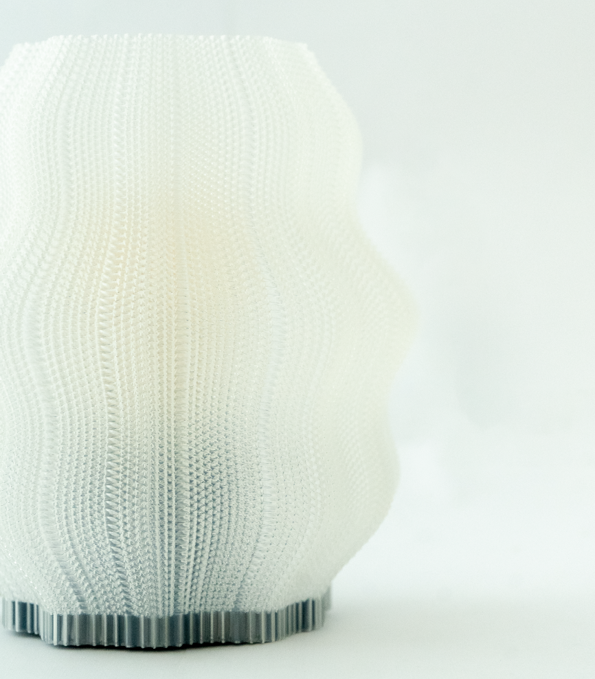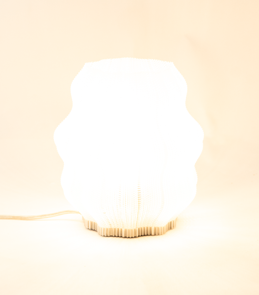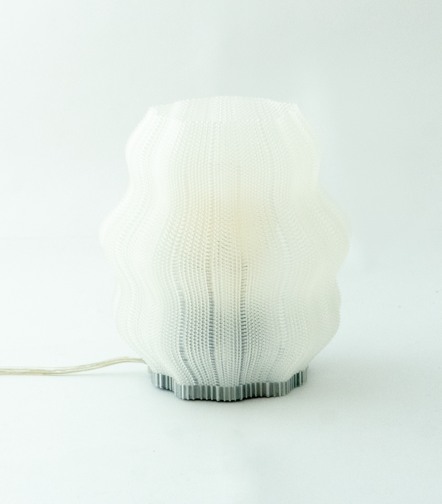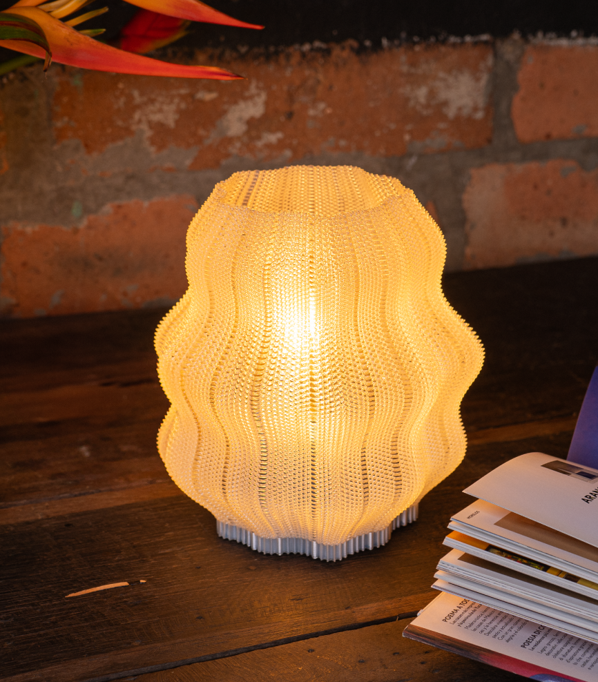 Inspirada en las formas de una medusa, esta lámpara hecha en PLA a base de almidón de maíz se imprime en 3D con una textura tejida capa por capa que le da ese toque divertido e irregular. Su pantalla traslúcida deja pasar la luz de forma suave, dejando ver lo justo y creando un ambiente bacano y relajado.