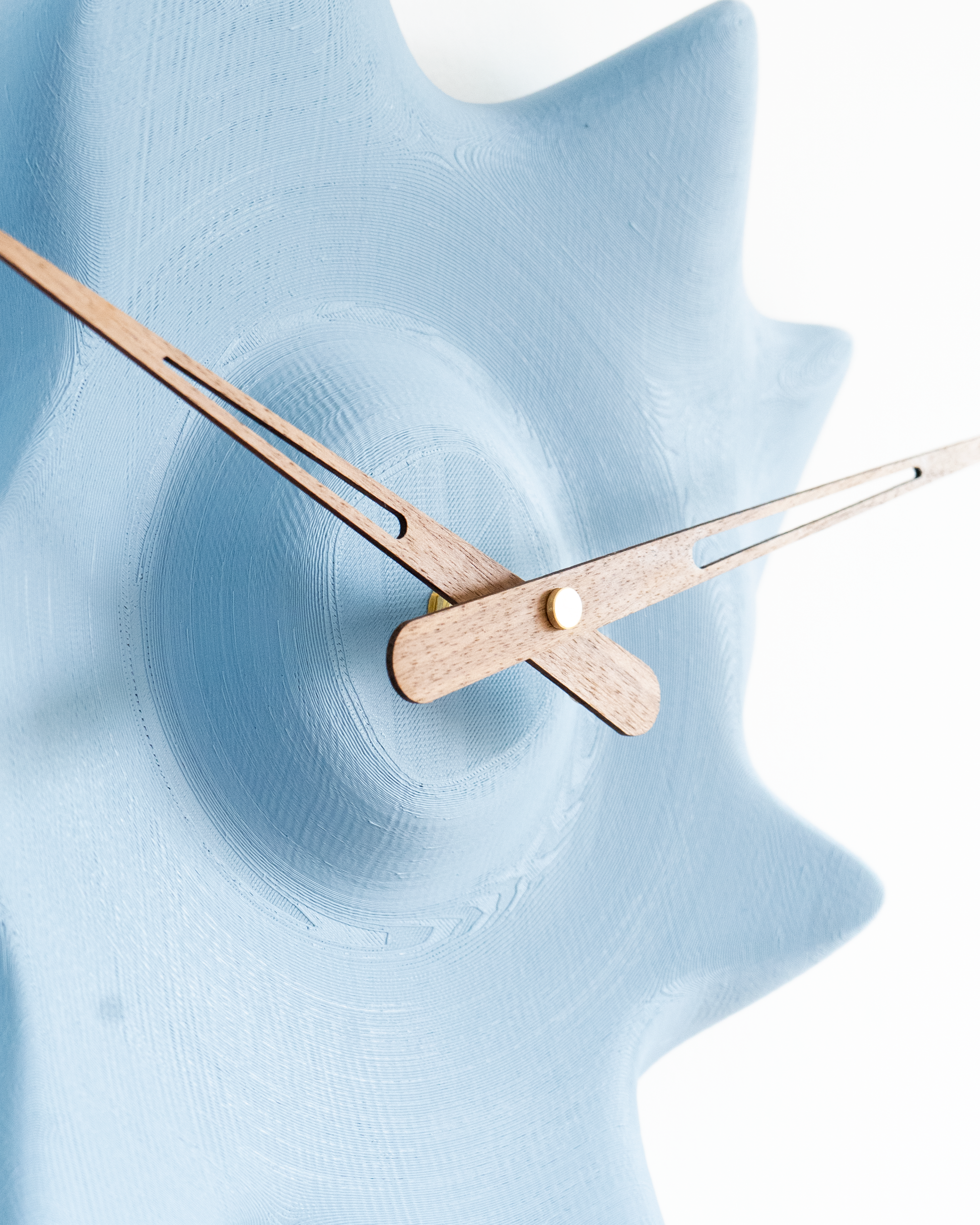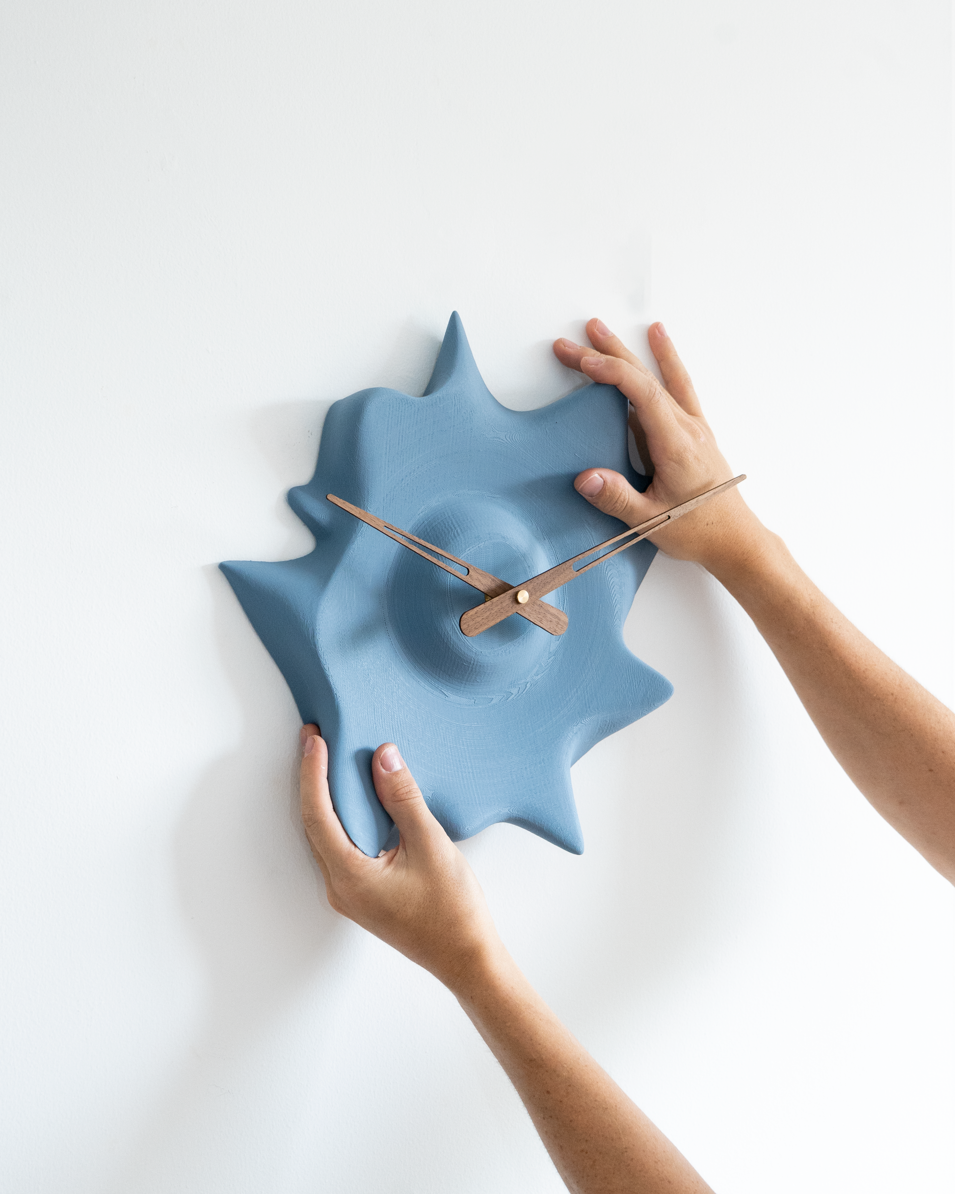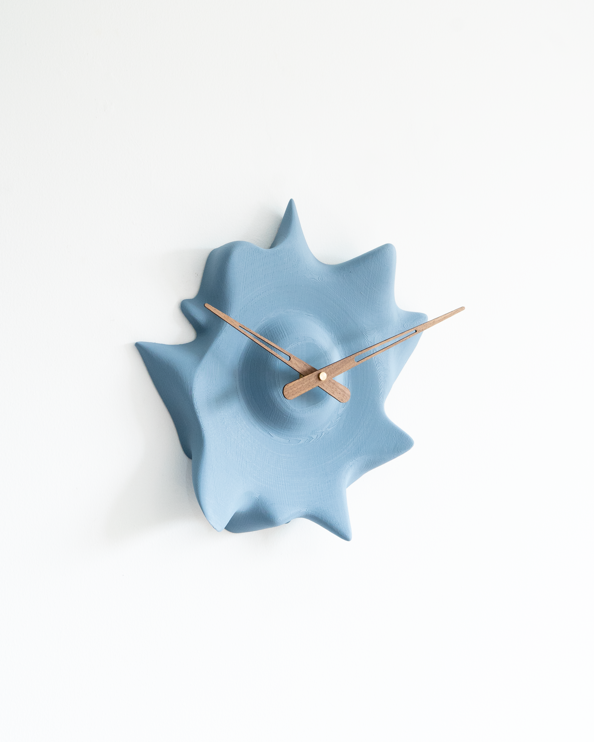 El reloj de pared .Mucula_01 parece atrapado en pleno movimiento, como si la pintura de la pared siguiera fresca y el tiempo hubiera caído sobre ella para dejar su marca. Su contorno orgánico, lleno de picos y ondulaciones, es una interpretación de la fluidez del tiempo: nunca quieto, siempre en transformación. Impreso en 3D con PLA de maíz, es una pieza funcional y a la vez escultórica que convierte cualquier muro en un pequeño recordatorio de que el instante se escapa mientras lo mirás.