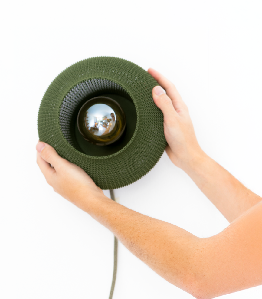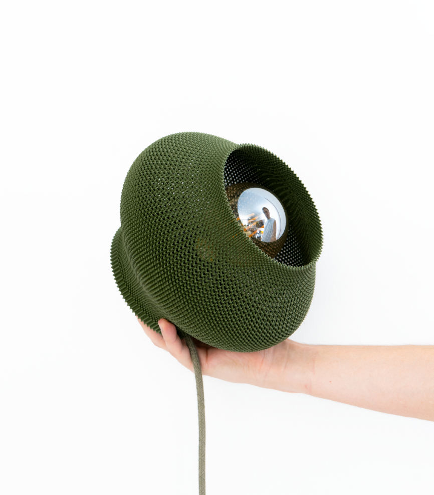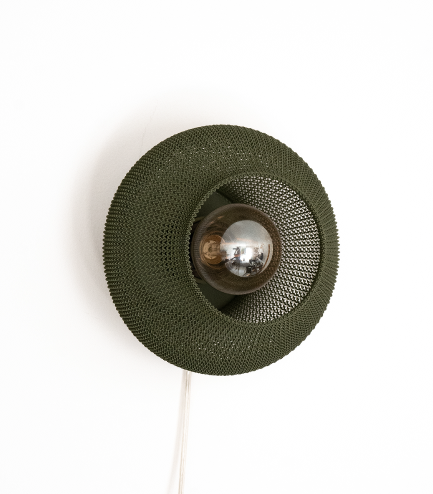 Este aplique parece un hongo que brota de la pared, expandiéndose para soltar una luz cálida que se filtra por su tejido capa por capa. Impreso en 3D en PLA a base de maíz, su forma orgánica crea unos rayos de luz espectaculares que se proyectan sobre la pared, llenando el espacio de textura y calidez.